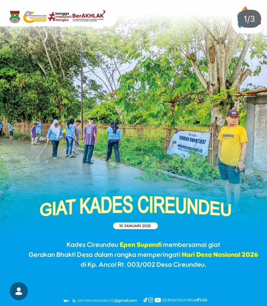 Dalam rangka memperingati Hari Desa Nasional 2026, Kepala Desa Cireundeu, Pepen Supendi, melaksanakan kegiatan Gerakan Bhakti Desa berupa gotong royong membersihkan lingkungan desa. Kegiatan ini berlangsung di Kampung Ancol RT 003/002, Desa Cireundeu, Kecamatan Solear, Kabupaten Tangerang, dengan melibatkan berbagai unsur masyarakat.